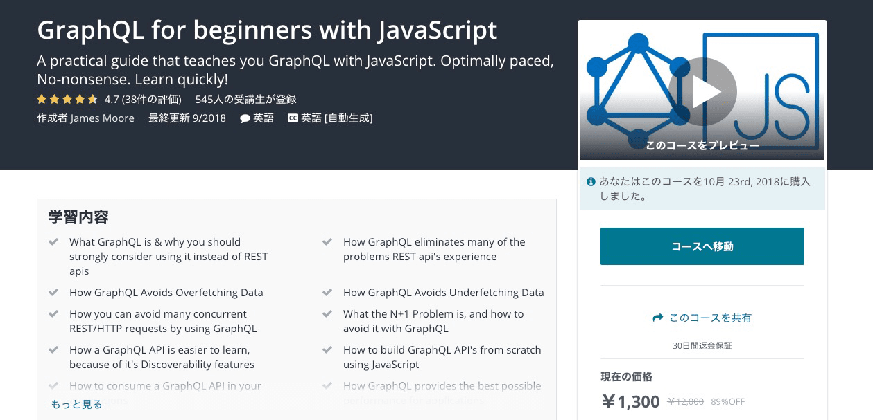 上記理由を踏まえて、公式の説明やHow to GraphQL、公式のGetting Started With GraphQL.jsを読んでみたものの、雑感は分かりつつも足りない感じがあり、2周目的な教材をやってみたくて受講してみました。